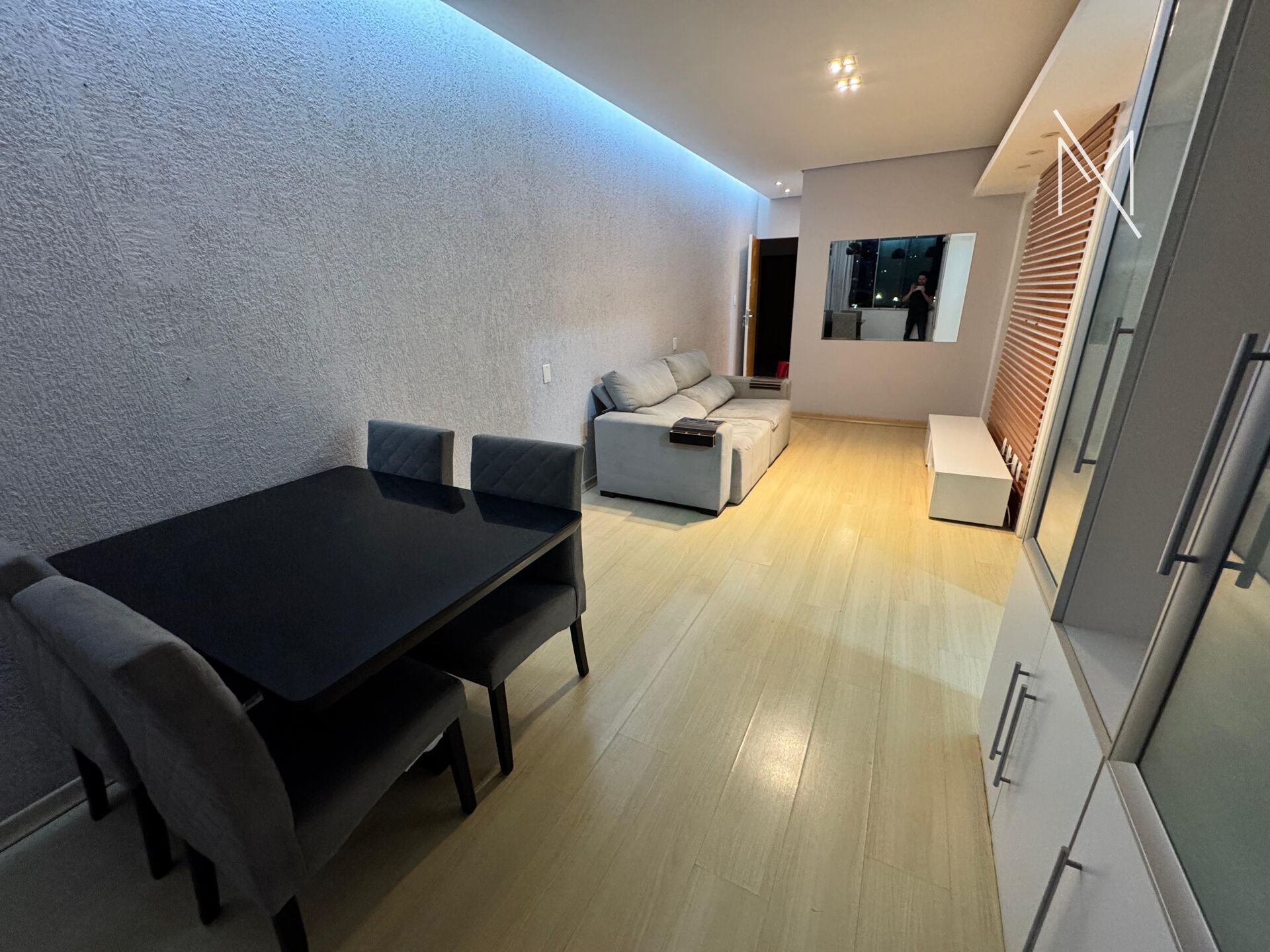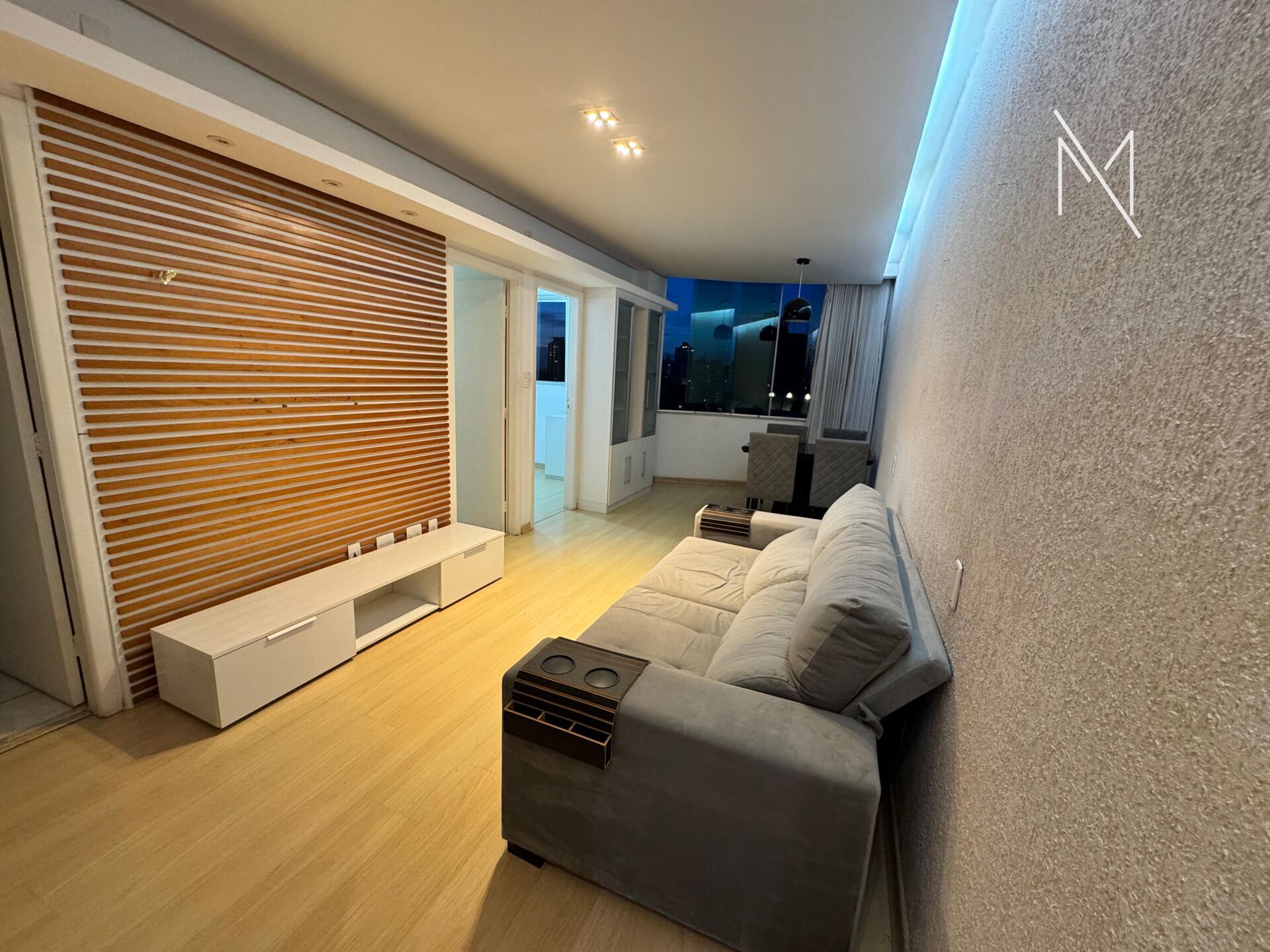 Sala para dois ambientes, com iluminação planejada e varanda incorporada, trazendo mais espaço e conforto. São 2 quartos com armários planejados, sendo 1 suíte. Banheiro social. Cozinha funcional com armários e área de serviço. Piso em porcelanato em todo o imóvel.