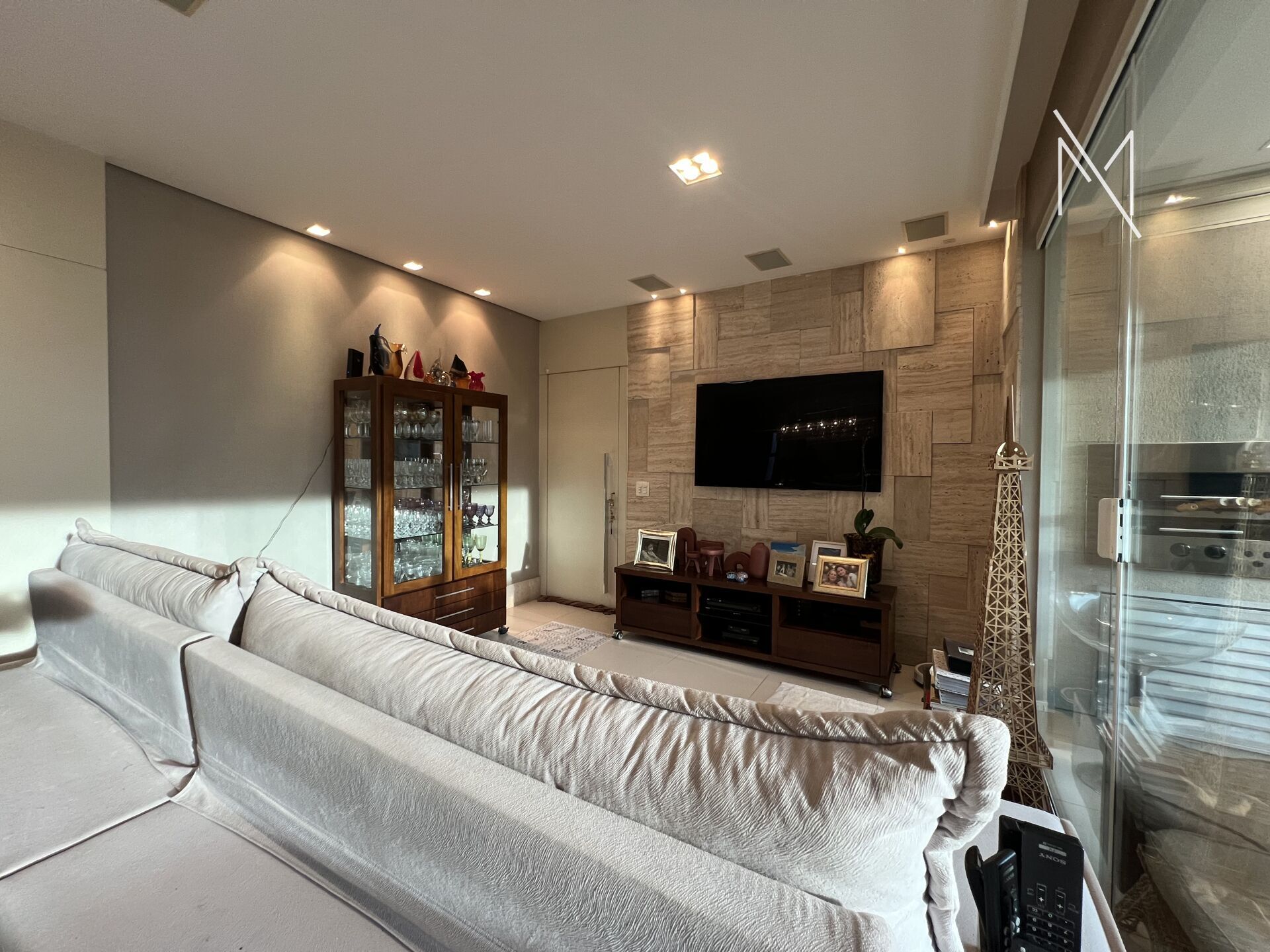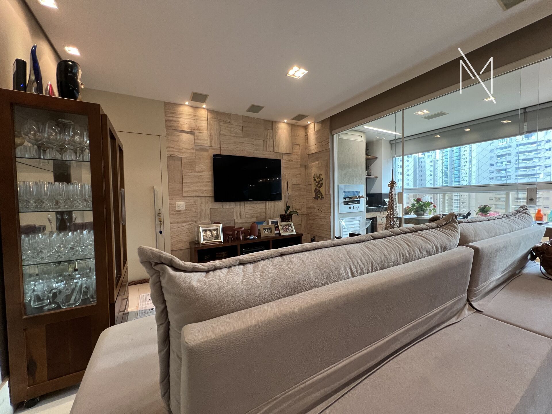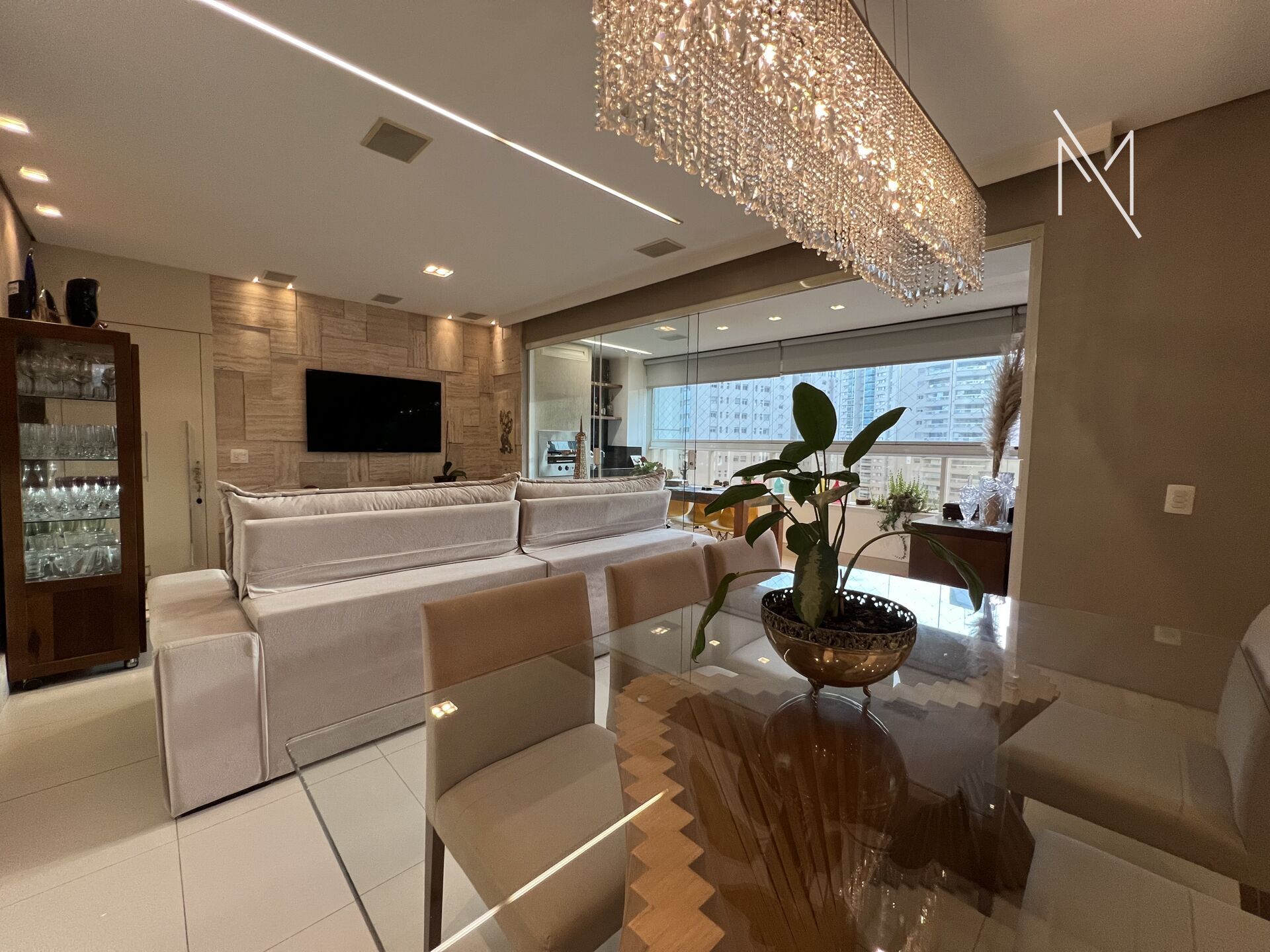 Apartamento 113m² com sala ampla, lavabo e varanda gourmet com churrasqueira.