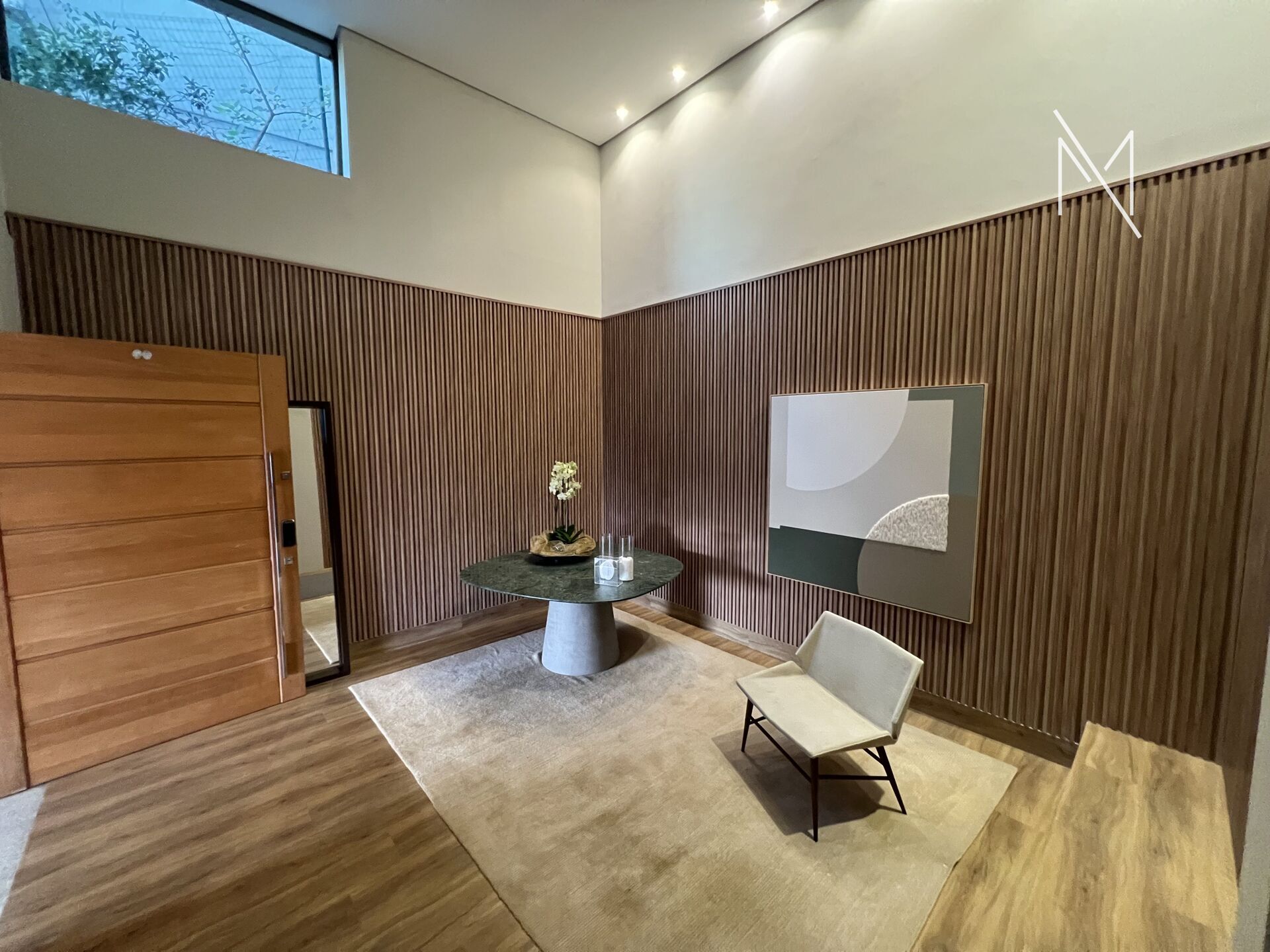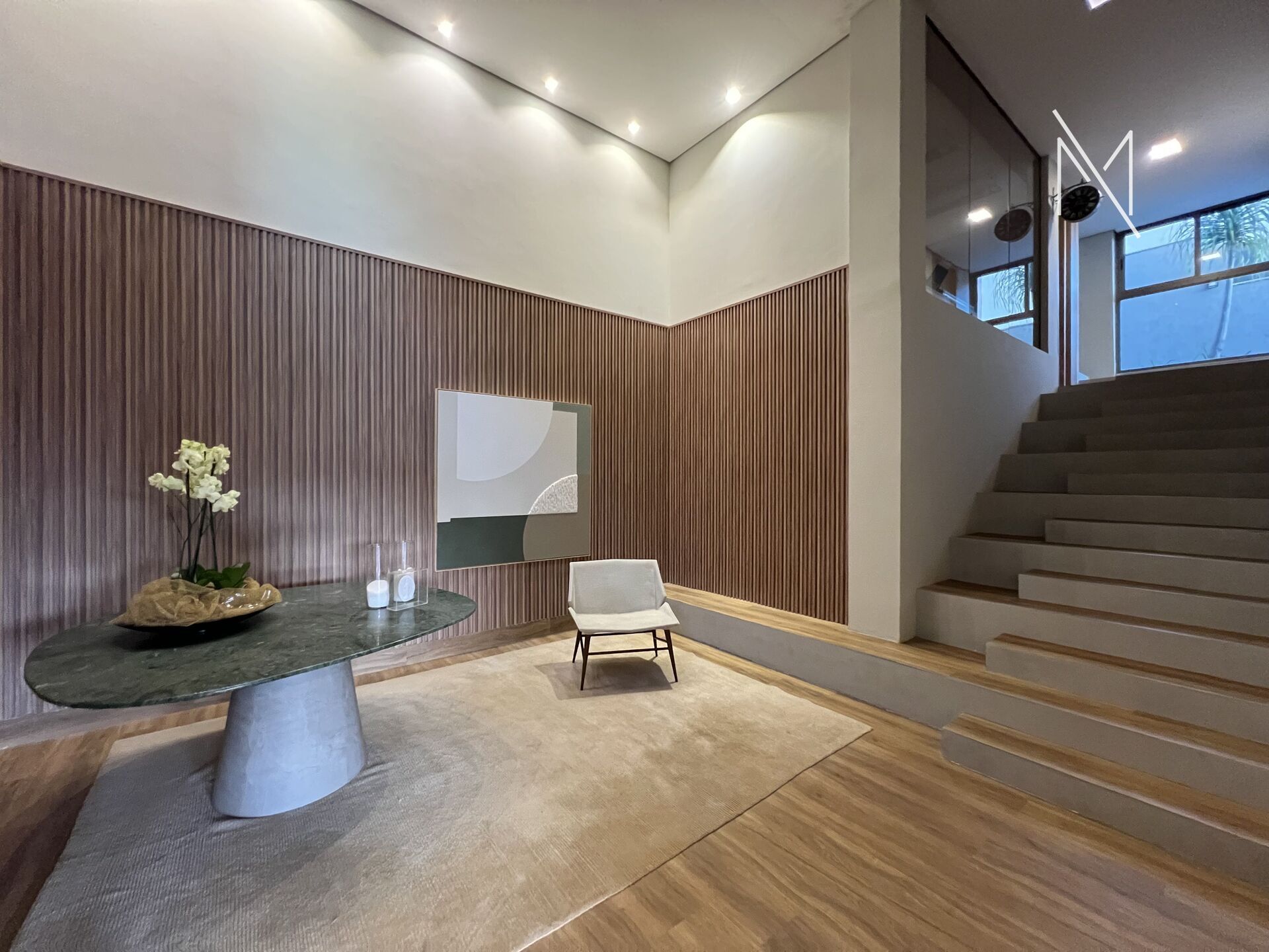 Sala com pé direito duplo toda em vidro com vista deslumbrante. São 3 ambientes integrados com a cozinha. Lavabo. Sala de jantar conectada com um lindo jardim na área externa. Local perfeito para relaxar.