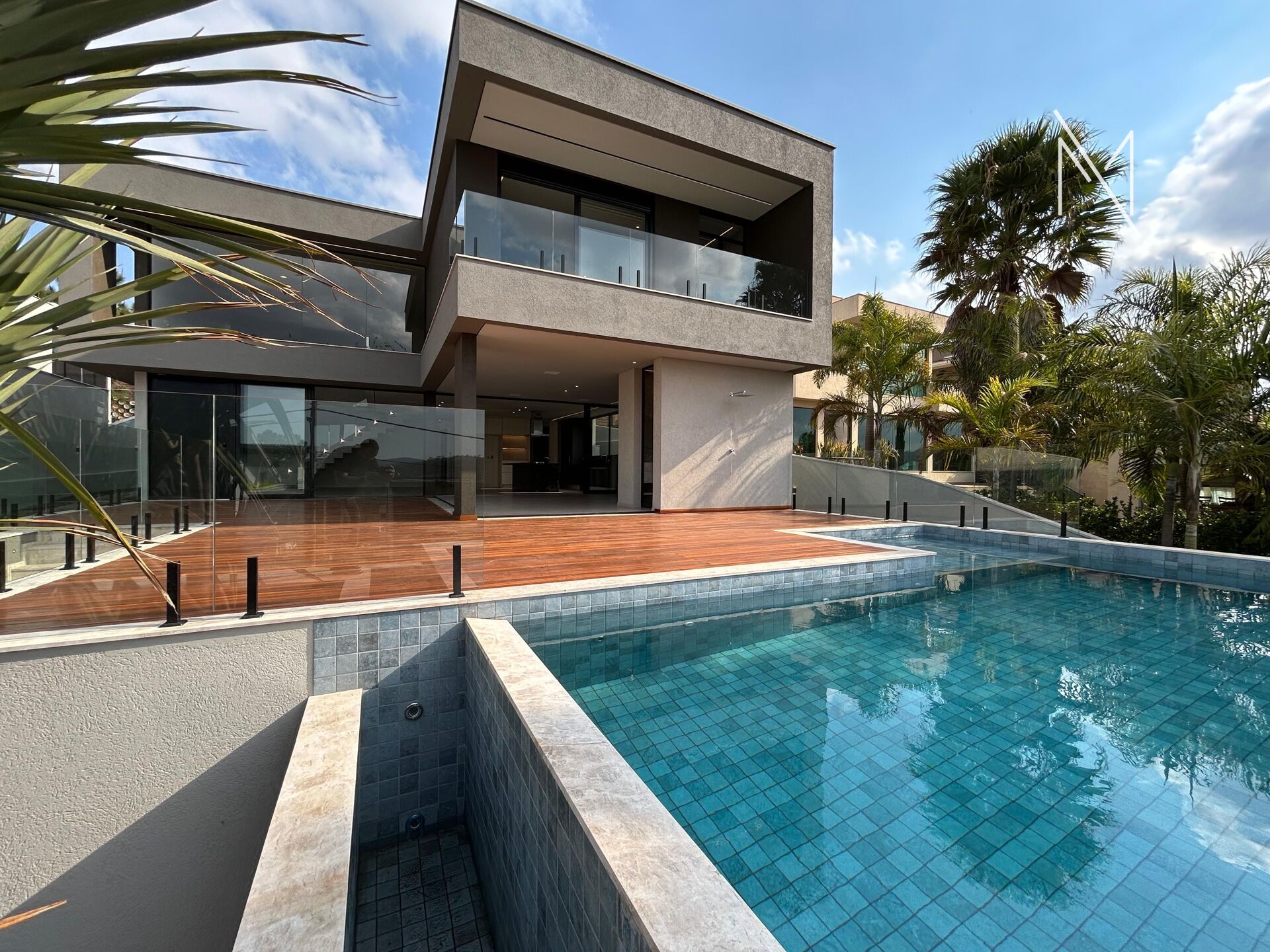 - Piscina com borda infinita, deck e lavabo externo.